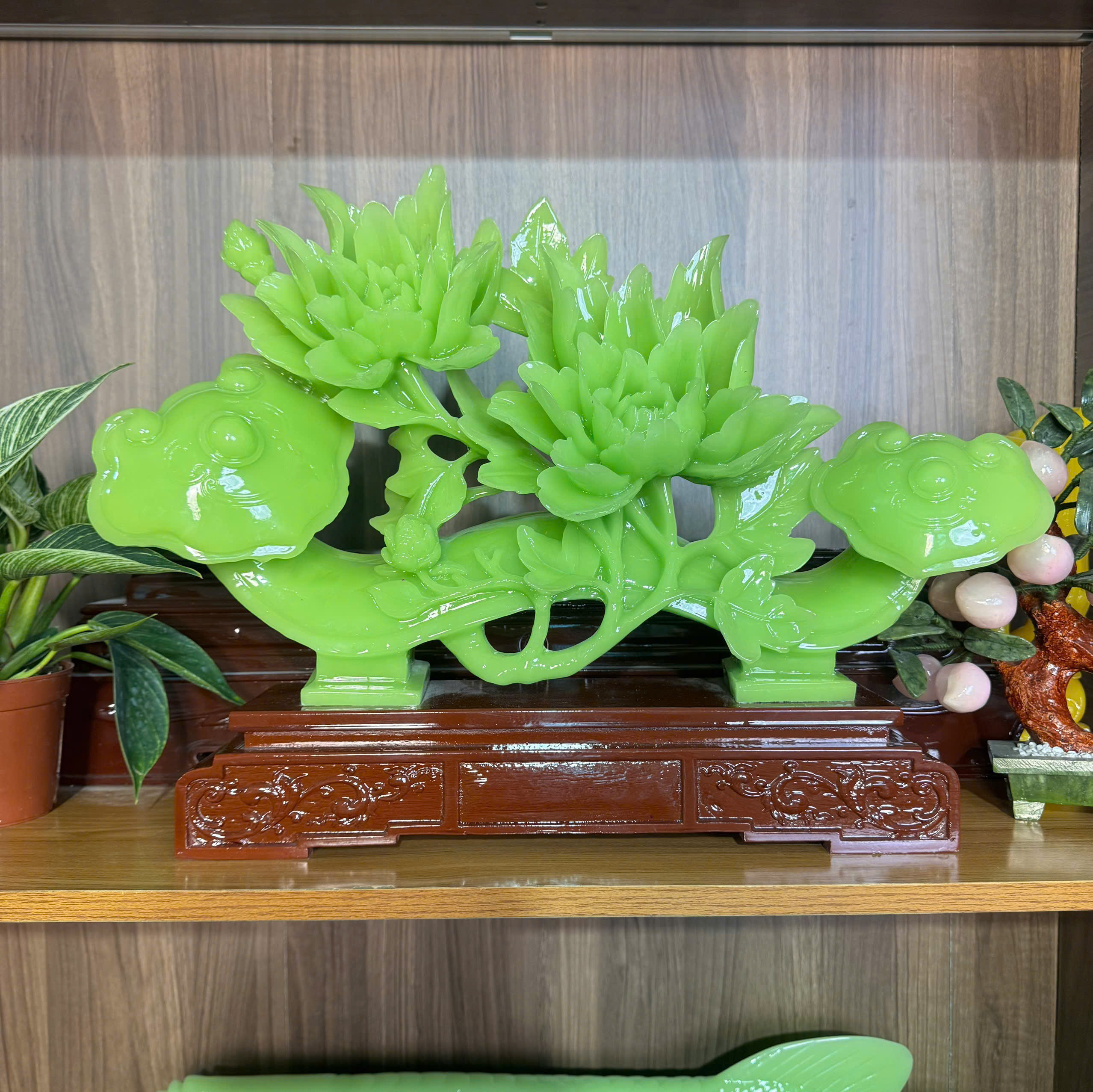 Gậy như ý bên hoa mẫu đơn. Đặc trưng của gậy như ý phong thuỷ là có phần đầu lớn và cong, trang trí theo hình đám mây. gậy như ý bằng đá… Đặc biệt các doanh nhân, lãnh đạo, những người quyền chức và bề thế sẽ luôn có ít nhất 1 chiếc gậy như ý phong thuỷ để phù trợ cho công danh, sự nghiệp của mình. Đúng như tên gọi của mình thì gậy như ý tượng trưng cho việc cầu gì được nấy. Những điều mong đợi sớm hay muộn cũng sẽ đến với chủ nhân. Gậy như ý sẽ giúp cho bạn củng cố thêm địa vị, quyền lực bản thân, tránh bị tiểu nhân hay cấp dưới lấn át, lộng quyền gây tổn hại. Không chỉ thế gậy còn tăng nhanh công danh, sự tôn nghiêm, củng cố hơn nữa sức ảnh hưởng cho gia chủ. Được kết hợp cùng tượng hoa mẫu đơn. Theo phong thủy, hình tượng Hoa Mẫu Đơn được biết đến là một loài hoa vương giả mang nét đẹp sang trọng, quý phái. Chúng cũng được nhiều người xem là hình ảnh tượng trưng cho sự vương giả, giàu có cũng như thịnh vượng của một gia đình.